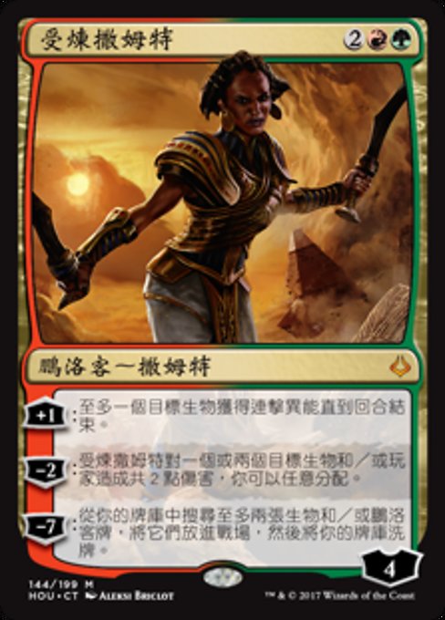 ![]() Variations— Parts— | Samut, the Tested+1 : Up to one target creature gains double strike until end of turn. −2 : Samut deals 2 damage divided as you choose among one or two targets. −7 : Search your library for up to two creature and/or planeswalker cards, put them onto the battlefield, then shuffle.