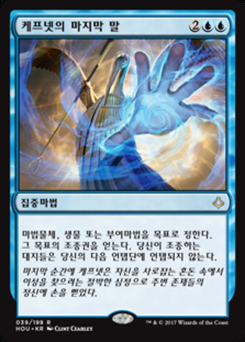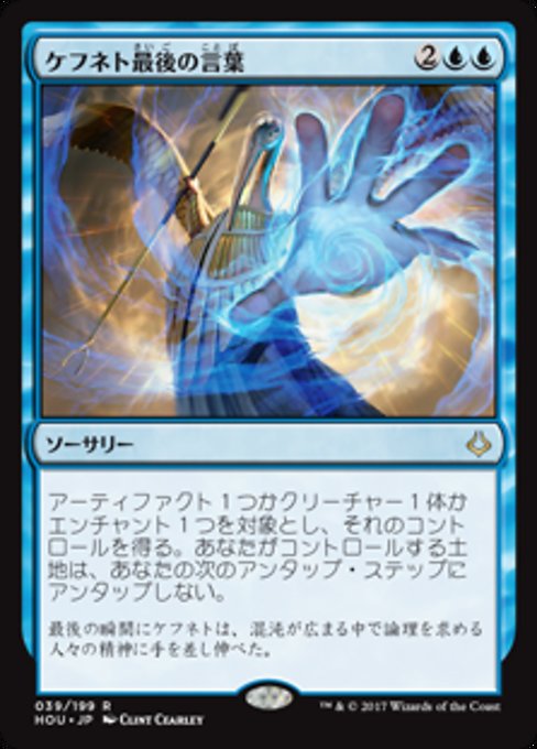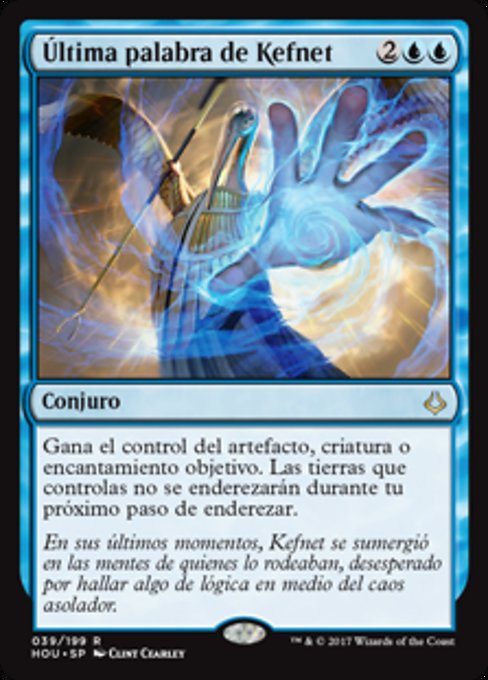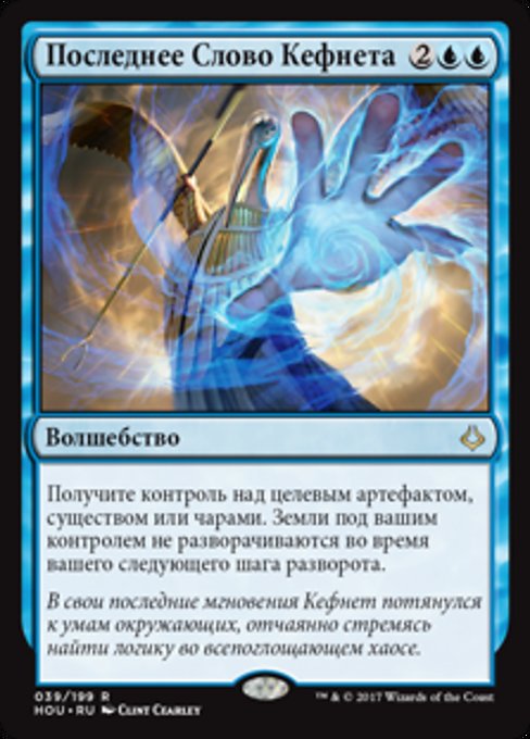 |  Variations— Parts— | Kefnet's Last WordGain control of target artifact, creature, or enchantment. Lands you control don't untap during your next untap step.