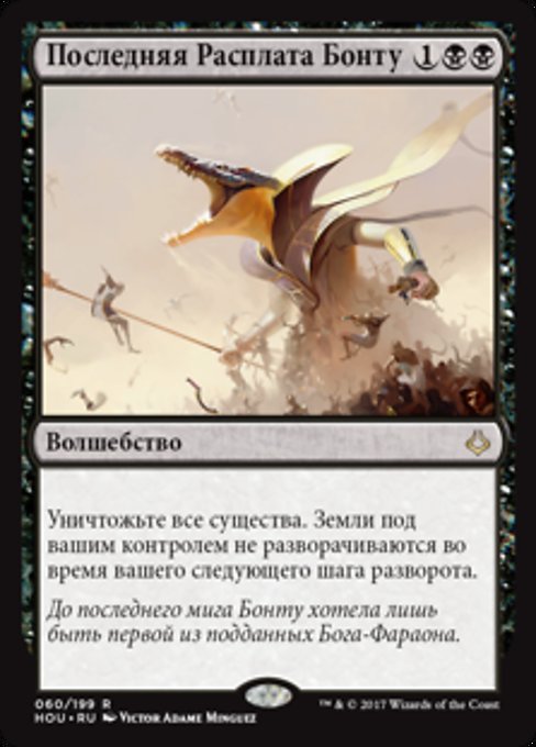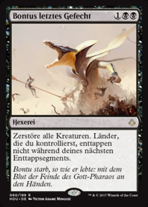 |  Variations— Parts— | Bontu's Last ReckoningDestroy all creatures. Lands you control don't untap during your next untap step.