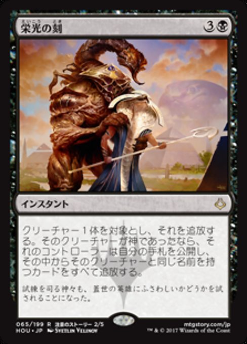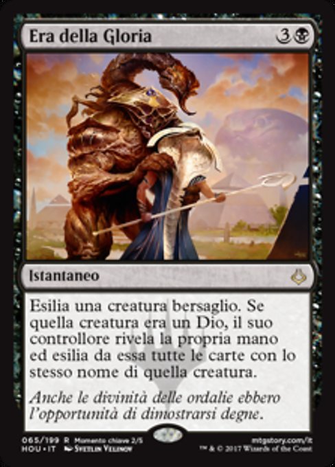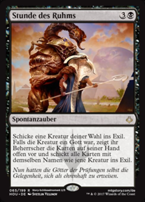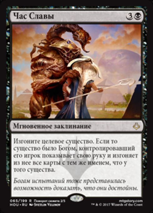 |  Variations— Parts— | Hour of GloryExile target creature. If that creature was a God, its controller reveals their hand and exiles all cards from it with the same name as that creature.