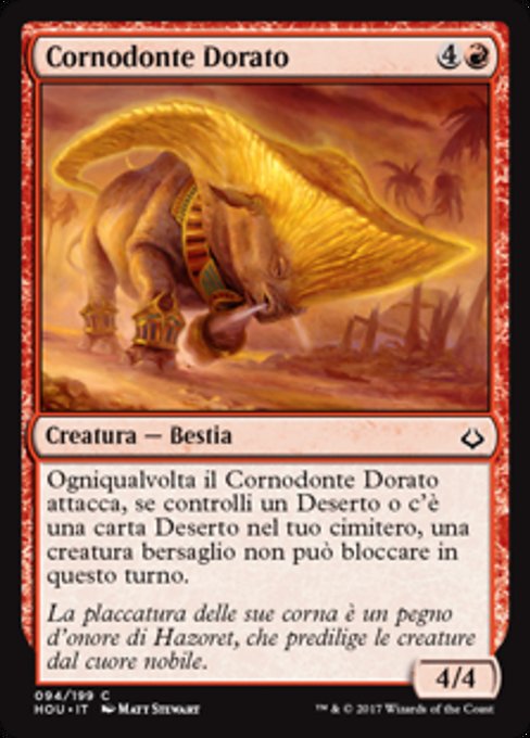 ![]() Variations— Parts— | Gilded Cerodon4 / 4 Whenever this creature attacks, if you control a Desert or there is a Desert card in your graveyard, target creature can't block this turn.