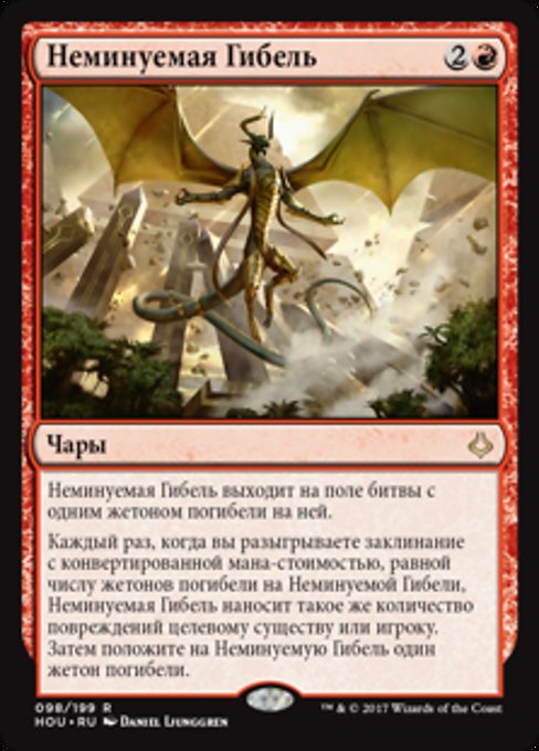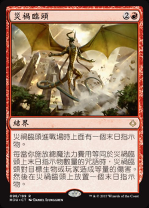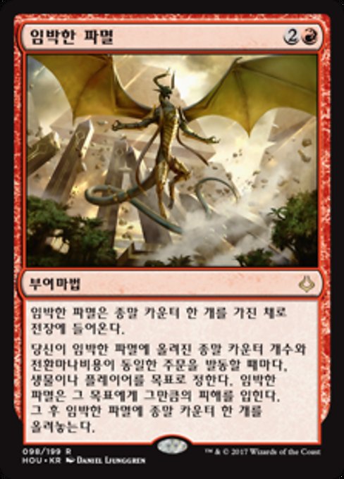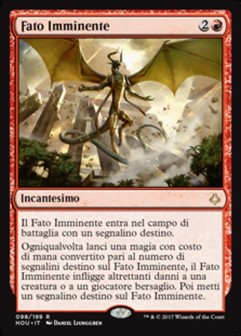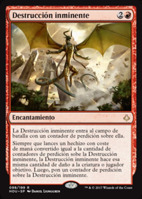 |  Variations— Parts— | Imminent DoomThis enchantment enters with a doom counter on it. Whenever you cast a spell with mana value equal to the number of doom counters on this enchantment, this enchantment deals that much damage to any target. Then put a doom counter on this enchantment.