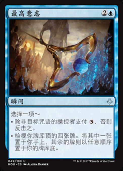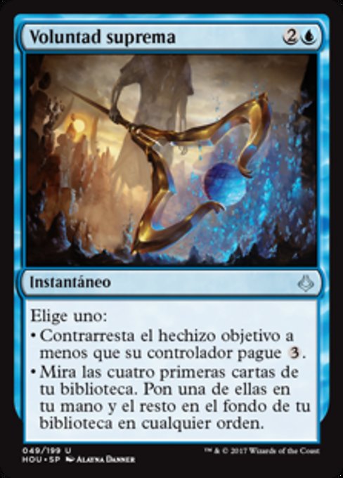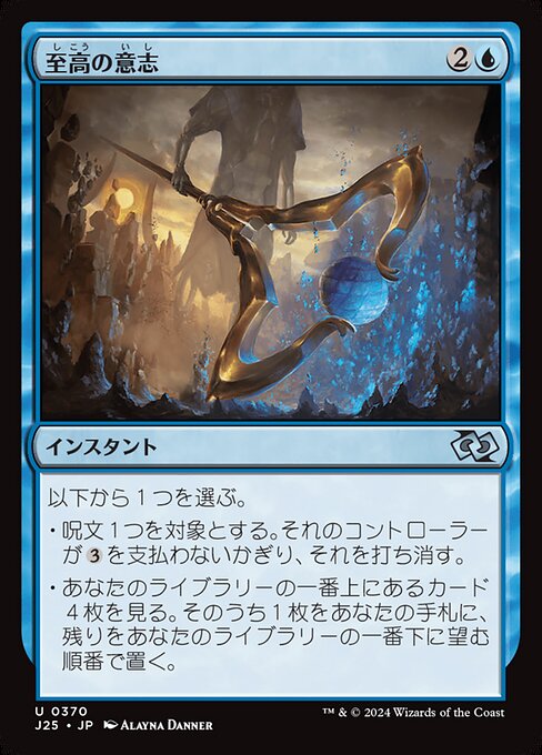 |  Variations— Parts— | 至高の意志以下から1つを選ぶ。 • 呪文1つを対象とする。それのコントローラーが • あなたのライブラリーの一番上からカードを4枚見る。そのうち1枚をあなたの手札に加え、残りをあなたのライブラリーの一番下に望む順番で置く。