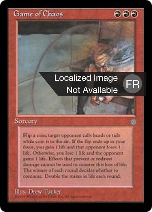 |  Variations— Parts— | Game of ChaosFlip a coin. If you win the flip, you gain 1 life and target opponent loses 1 life, and you decide whether to flip again. If you lose the flip, you lose 1 life and that opponent gains 1 life, and that player decides whether to flip again. Double the life stakes with each flip.