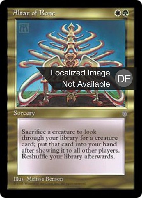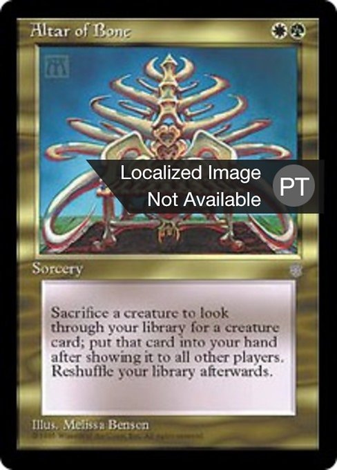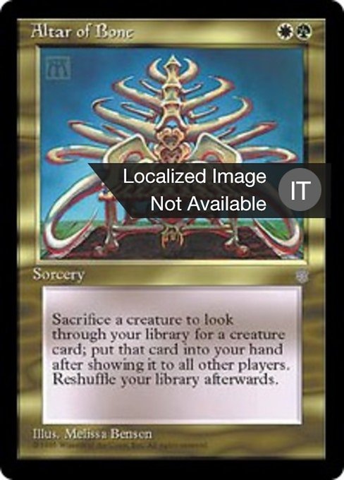 |  Variations— Parts— | Altar of BoneAs an additional cost to cast this spell, sacrifice a creature. Search your library for a creature card, reveal it, put it into your hand, then shuffle.