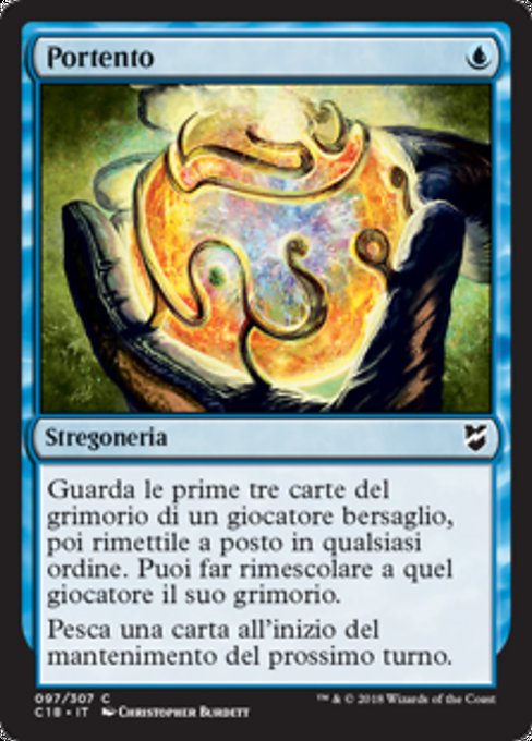 ![]() Variations— Parts— | PortentoLook at the top three cards of target player's library, then put them back in any order. You may have that player shuffle. Draw a card at the beginning of the next turn's upkeep.