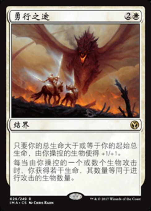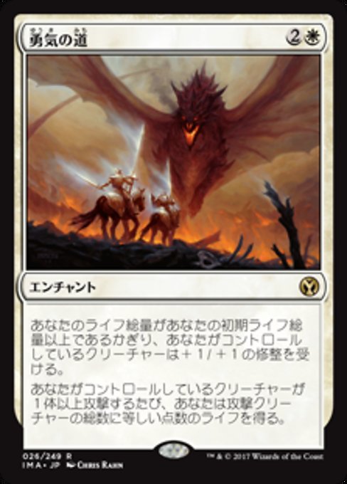 ![]() Variations— Parts— | Path of BraveryAs long as your life total is greater than or equal to your starting life total, creatures you control get +1/+1. Whenever one or more creatures you control attack, you gain life equal to the number of attacking creatures.