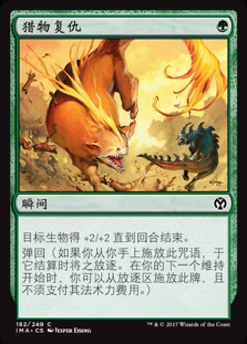 |  Variations— Parts— | 餌食の復讐クリーチャー1体を対象とする。ターン終了時まで、それは+2/+2の修整を受ける。 反復(この呪文があなたの手札から唱えられたなら、これの解決に際し、これを追放する。あなたの次のアップキープの開始時に、あなたは追放領域からこのカードをこれのマナ・コストを支払うことなく唱えてもよい。)