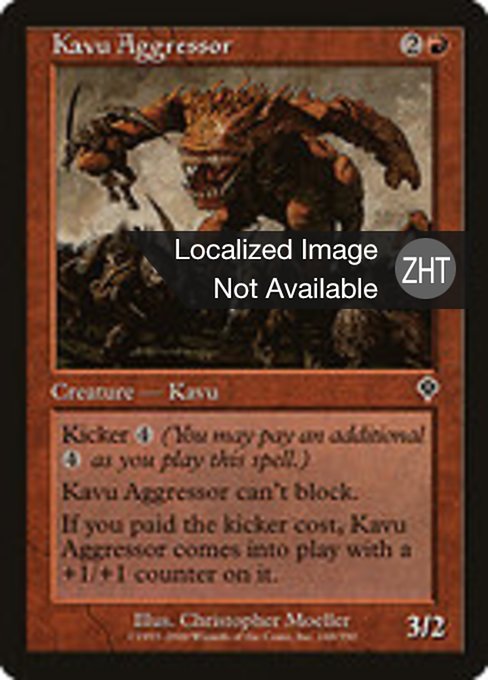 |  Variations— Parts— | Kavu Aggressor3 / 2 Kicker  This creature can't block. If this creature was kicked, it enters with a +1/+1 counter on it.