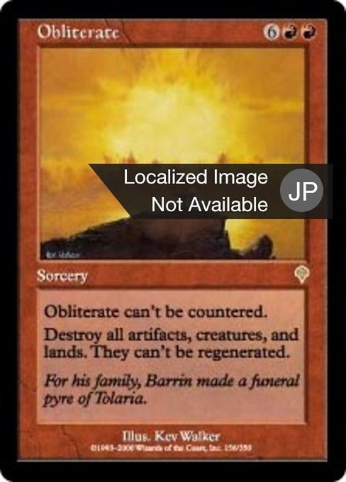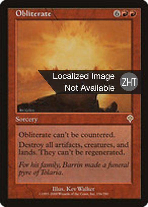 |  Variations— Parts— | ObliterateThis spell can't be countered. Destroy all artifacts, creatures, and lands. They can't be regenerated.