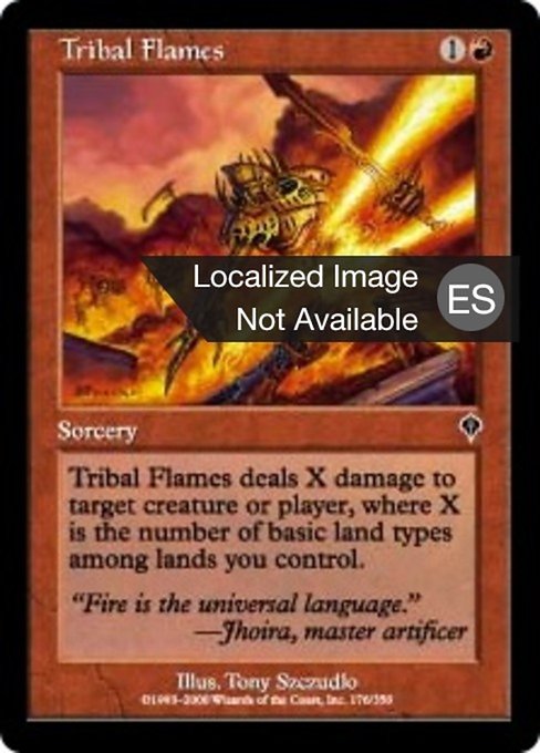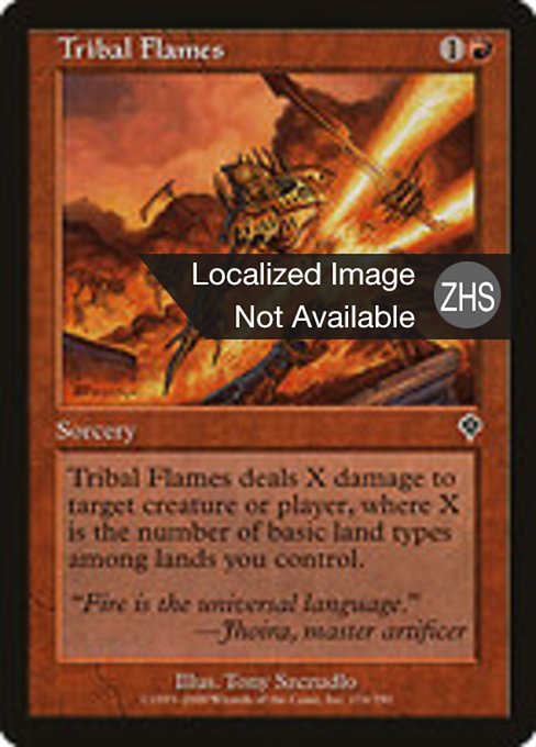 |  Variations— Parts— | Tribal FlamesDomain — Tribal Flames deals X damage to any target, where X is the number of basic land types among lands you control.