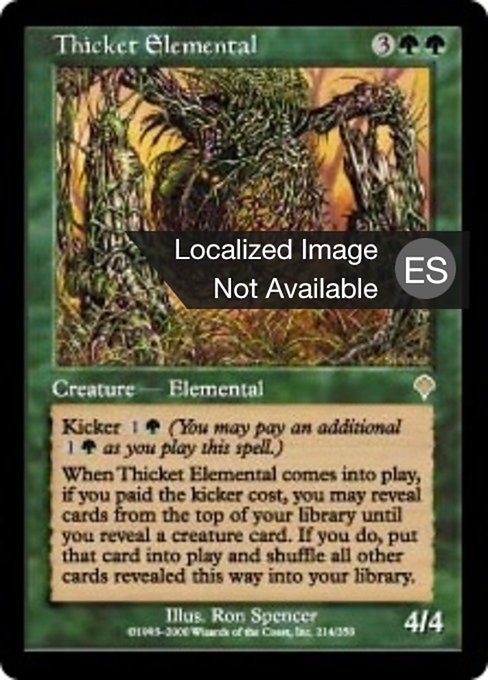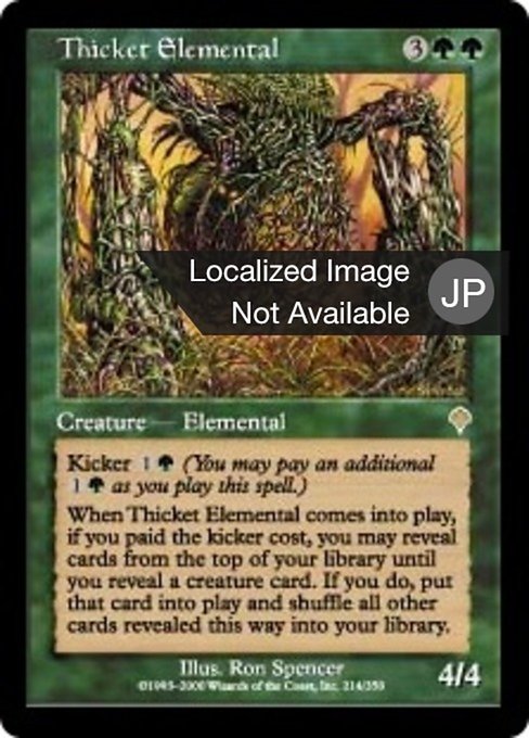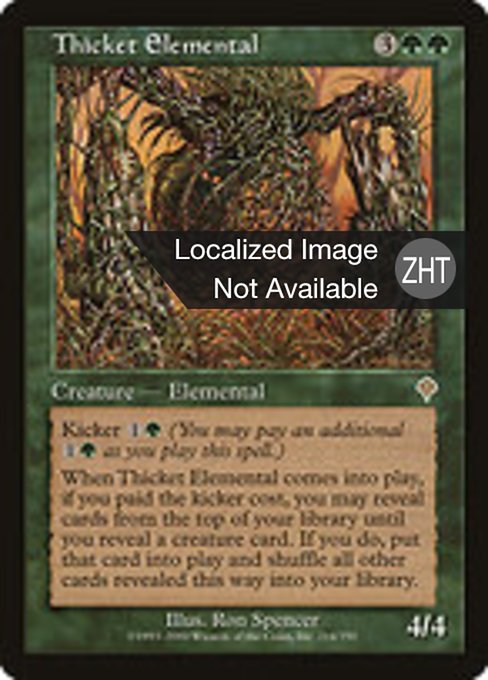 ![]() Variations— Parts— | Thicket Elemental4 / 4 Kicker When this creature enters, if it was kicked, you may reveal cards from the top of your library until you reveal a creature card. If you do, put that card onto the battlefield and shuffle all other cards revealed this way into your library.