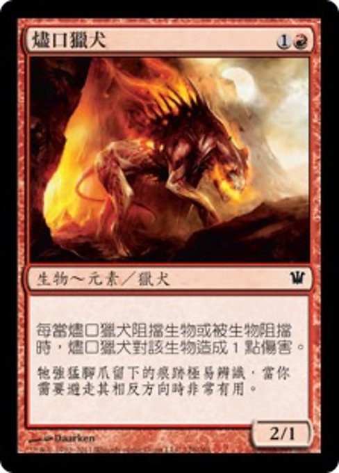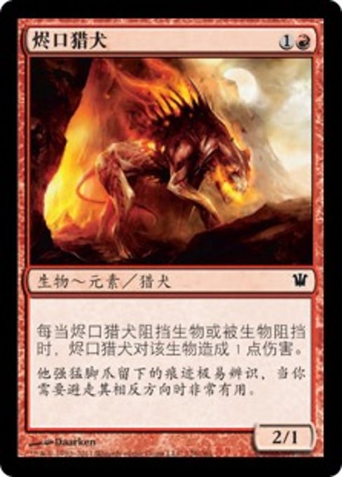 ![]() Variations— Parts— | Ashmouth Hound2 / 1 Whenever this creature blocks or becomes blocked by a creature, this creature deals 1 damage to that creature.