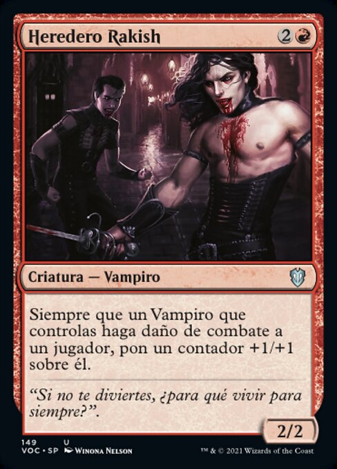 ![]() Variations— Parts— | Heredero Rakish2 / 2 Siempre que un Vampiro que controles haga daño de combate a un jugador, pon un contador +1/+1 sobre él.