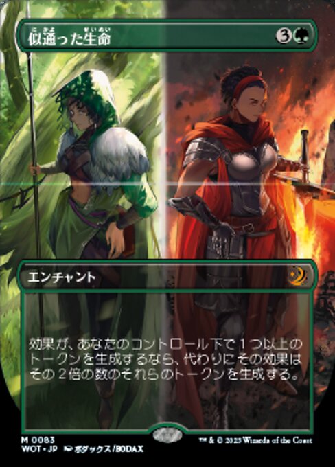 |  Variations— Parts— | 似通った生命いずれかの効果により1個以上のトークンがあなたのコントロール下で戦場に出る場合、代わりにそれはその2倍の数のトークンを戦場に出す。