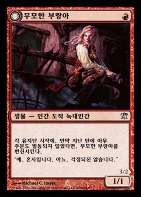 각 유지단 시작에, 만약 지난 턴에 아무 주문도 발동되지 않았다면, 무모한 부랑아를 변신시킨다.