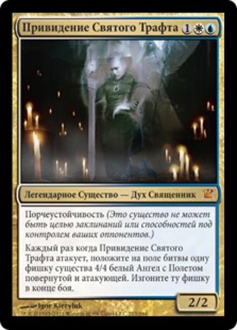 |  Variations— Parts— | Geist de Santo Traft2 / 2 Resistência à magia (Esta criatura não pode ser alvo de mágicas nem de habilidades que seus oponentes controlam.) Toda vez que Geist de Santo Traft atacar, coloque no campo de batalha uma ficha de criatura branca 4/4 do tipo Anjo com voar virada e atacando. Exile aquela ficha no final do combate.