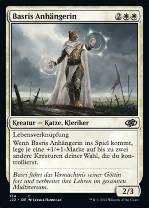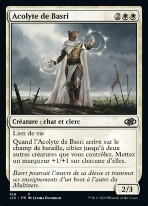 |  Variations— Parts— | Basri's Acolyte2 / 3 Lifelink (Damage dealt by this creature also causes you to gain that much life.) When this creature enters, put a +1/+1 counter on each of up to two other target creatures you control.