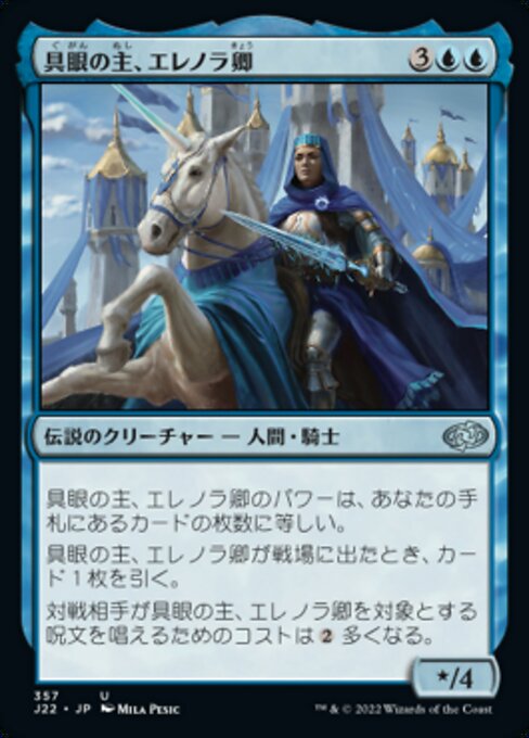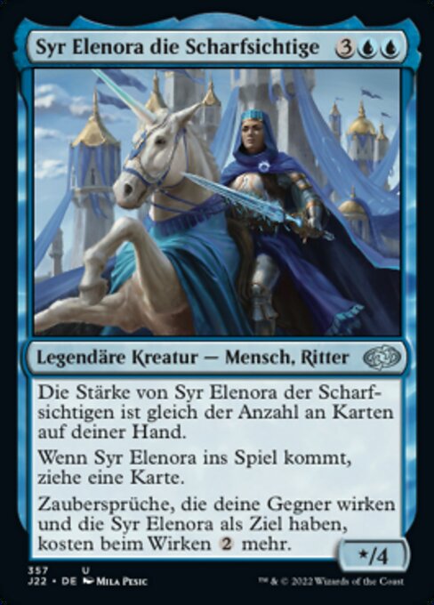 ![]() Variations— Parts— | Syr Elenora, the Discerning* / 4 Syr Elenora's power is equal to the number of cards in your hand. When Syr Elenora enters, draw a card. Spells your opponents cast that target Syr Elenora cost