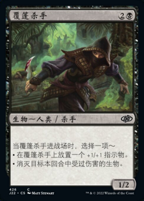 ![]() Variations— Parts— | Hooded Assassin1 / 2 When this creature enters, choose one — • Put a +1/+1 counter on this creature. • Destroy target creature that was dealt damage this turn.