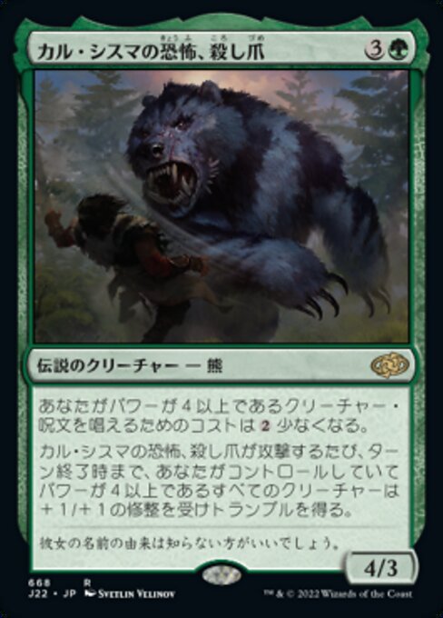 |  Variations— Parts— | Goreclaw, Terror of Qal Sisma4 / 3 Creature spells you cast with power 4 or greater cost  Whenever Goreclaw attacks, each creature you control with power 4 or greater gets +1/+1 and gains trample until end of turn.