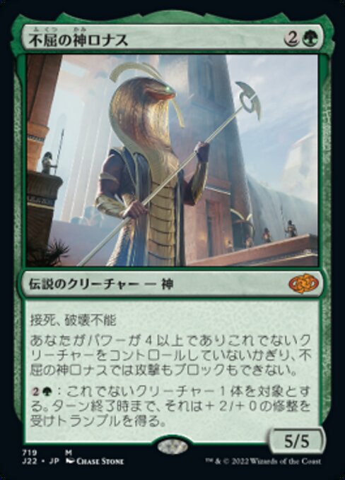 ![]() Variations— Parts— | Rhonas the Indomitable5 / 5 Deathtouch, indestructible Rhonas can't attack or block unless you control another creature with power 4 or greater.