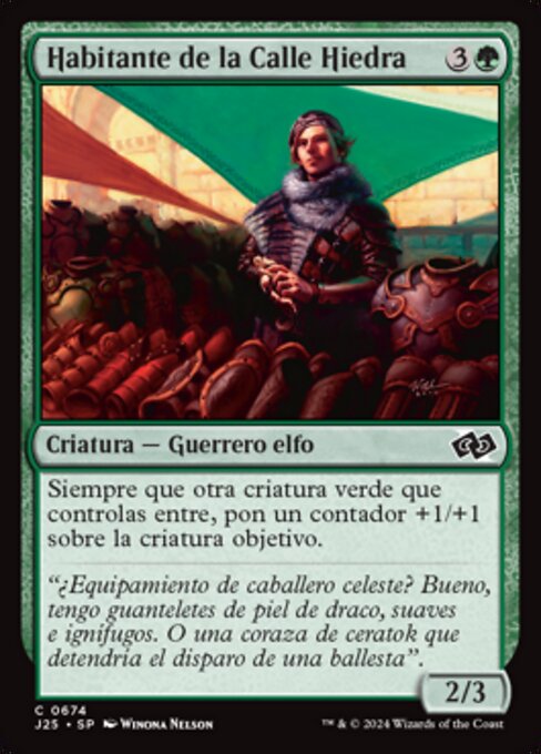 |  Variations— Parts— | Habitante de la Calle Hiedra2 / 3 Siempre que otra criatura verde entre al campo de batalla bajo tu control, pon un contador +1/+1 sobre la criatura objetivo.