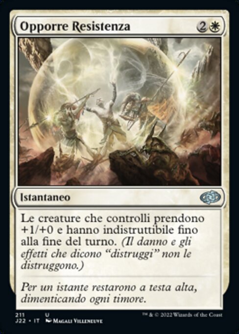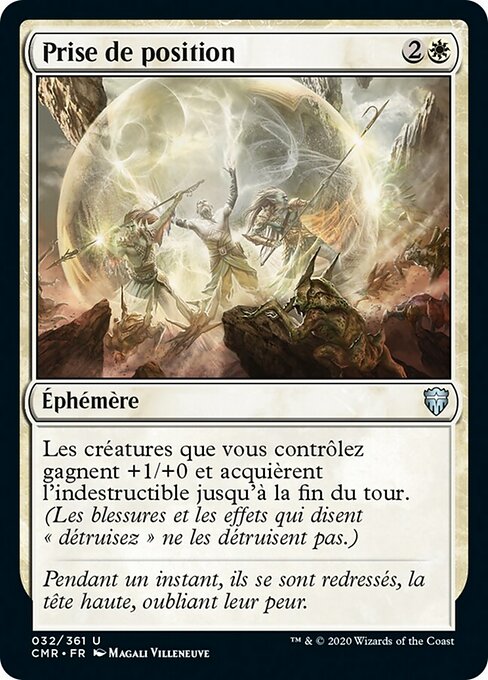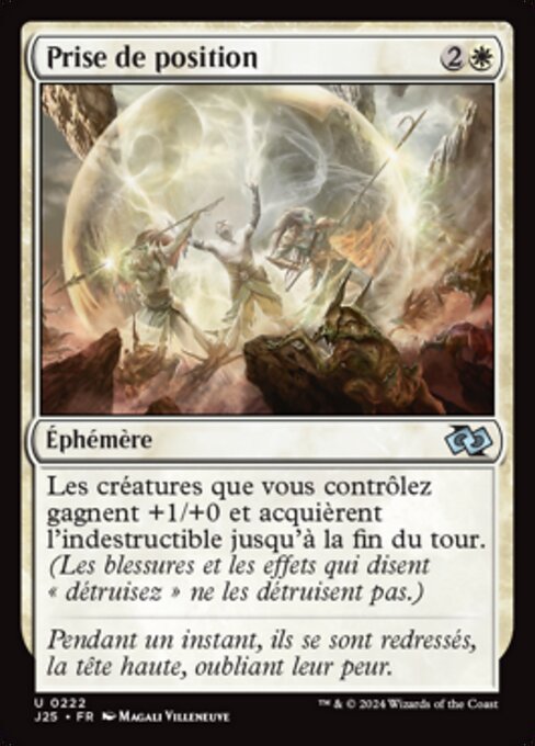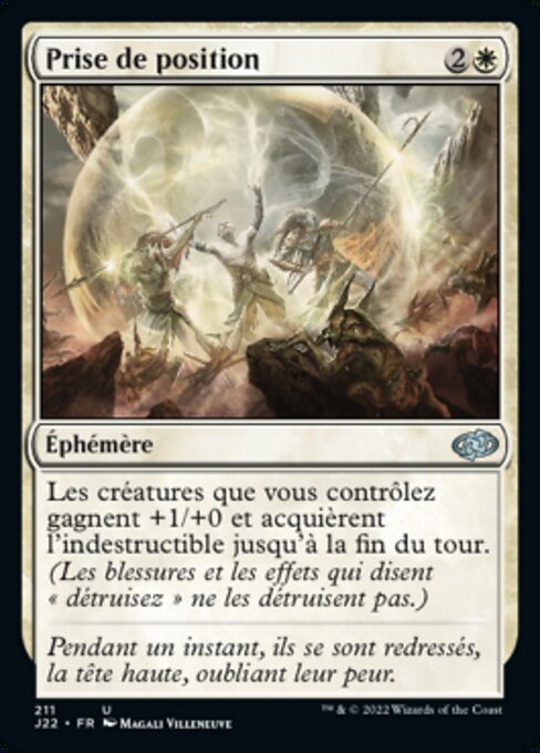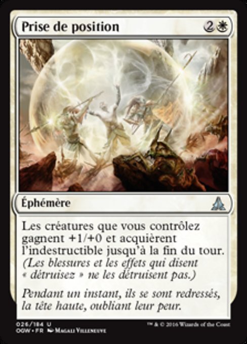 |  Variations— Parts— | Prise de positionLes créatures que vous contrôlez gagnent +1/+0 et acquièrent l'indestructible jusqu'à la fin du tour. (Les blessures et les effets qui disent « détruisez » ne les détruisent pas.)