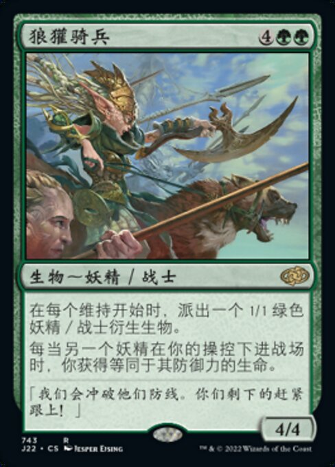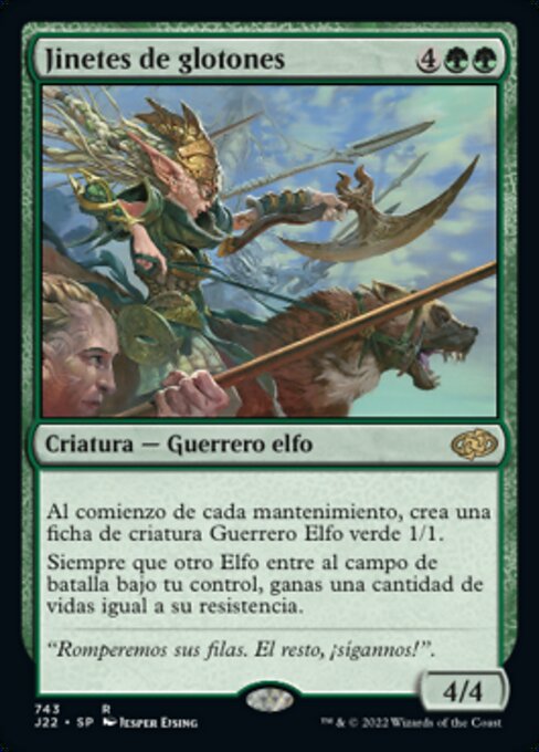 ![]() Variations— Parts— | Chevaucheurs de gloutons4 / 4 Au début de chaque entretien, créez un jeton de créature 1/1 verte Elfe et Guerrier. À chaque fois qu'un autre elfe arrive sur le champ de bataille sous votre contrôle, vous gagnez un nombre de points de vie égal à son endurance.