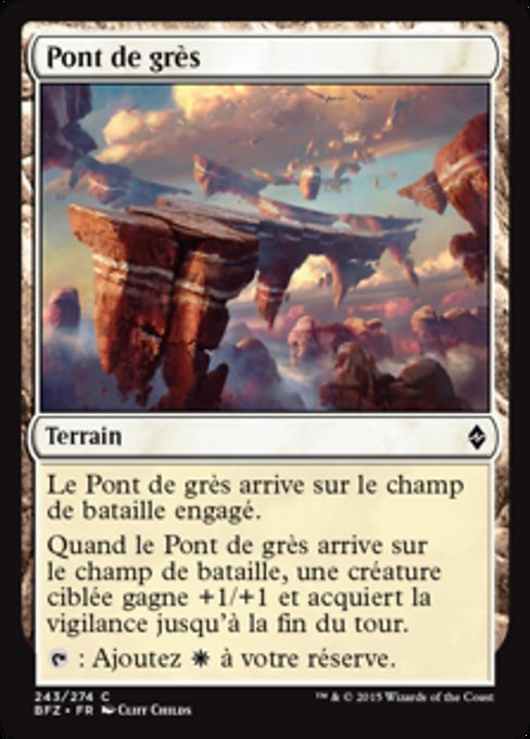|  Variations— Parts— | Pont de grèsLe Pont de grès arrive sur le champ de bataille engagé. Quand le Pont de grès arrive sur le champ de bataille, une créature ciblée gagne +1/+1 et acquiert la vigilance jusqu'à la fin du tour.