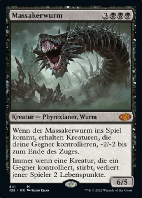 ![]() Variations— Parts— | Wurm della Strage6 / 5 Quando il Wurm della Strage entra nel campo di battaglia, le creature controllate dai tuoi avversari prendono -2/-2 fino alla fine del turno. Ogniqualvolta una creatura controllata da un avversario muore, quel giocatore perde 2 punti vita.