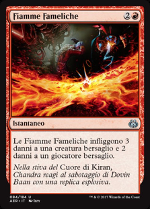 ![]() Variations— Parts— | Fiamme FamelicheLe Fiamme Fameliche infliggono 3 danni a una creatura bersaglio e 2 danni a un giocatore o a un planeswalker bersaglio.