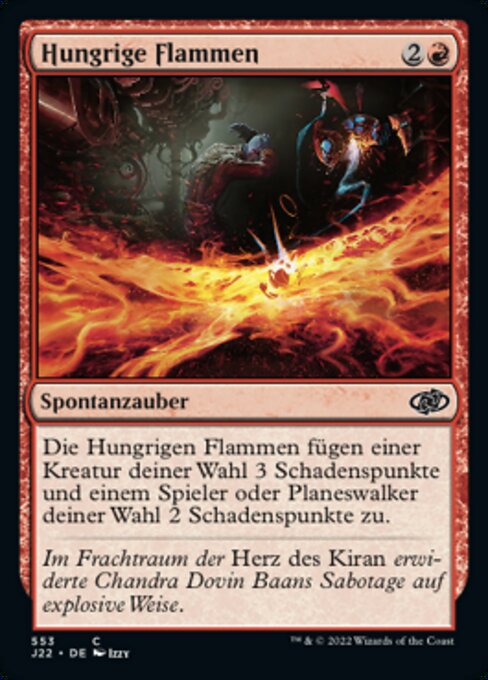 LegalitiesLegal Duel Brawl Legacy Modern Pauper Pioneer Vintage Historic Timeless Commander Gladiator Oathbreaker Paupercommander Not Legal Penny Predh Future Alchemy Standard Oldschool Premodern Standardbrawl RulingsYou can’t cast Hungry Flames unless you target both a creature and a player. If one target is illegal as Hungry Flames resolves, the spell deals damage to the remaining legal target.