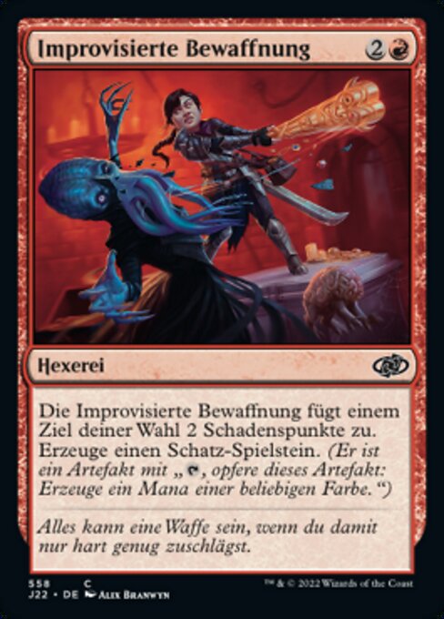 ![]() Variations— Parts— | Armi ImprovvisateLe Armi Improvvisate infliggono 2 danni a un qualsiasi bersaglio. Crea una pedina Tesoro. (È un artefatto con "
