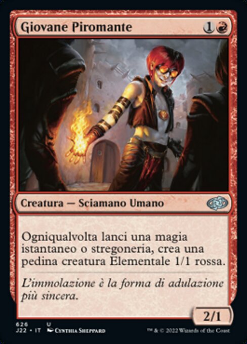 |  Variations— Parts— | Giovane Piromante2 / 1 Ogniqualvolta lanci una magia istantaneo o stregoneria, crea una pedina creatura Elementale 1/1 rossa.