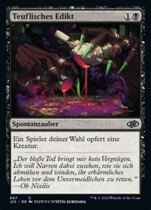 |  Variations— Parts— | Editto DiabolicoUn giocatore bersaglio sacrifica una creatura.