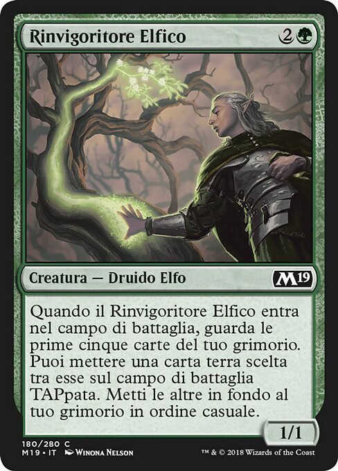 ![]() Variations— Parts— | Rinvigoritore Elfico1 / 1 Quando il Rinvigoritore Elfico entra nel campo di battaglia, guarda le prime cinque carte del tuo grimorio. Puoi mettere una carta terra scelta tra esse sul campo di battaglia TAPpata. Metti le altre in fondo al tuo grimorio in ordine casuale.