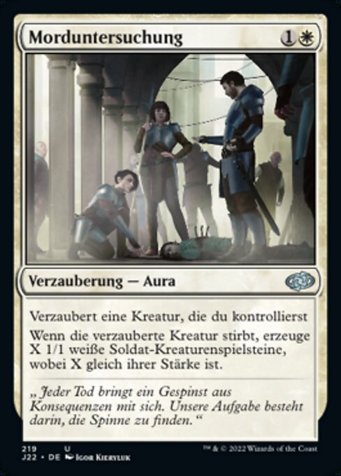 ![]() Variations— Parts— | 殺人の捜査エンチャント(あなたがコントロールしているクリーチャー) エンチャントしているクリーチャーが死亡したとき、白の1/1の兵士・クリーチャー・トークンX体を生成する。Xはエンチャントしているクリーチャーのパワーに等しい。