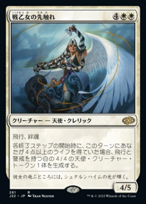 |  Variations— Parts— | 戦乙女の先触れ4 / 5 飛行、絆魂 各終了ステップの開始時に、このターンにあなたが4点以上のライフを得ていた場合、飛行と警戒を持つ白の4/4の天使・クリーチャー・トークン1体を生成する。
