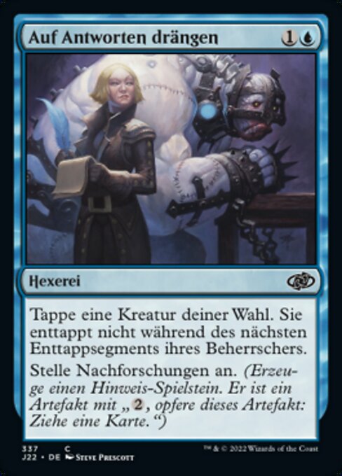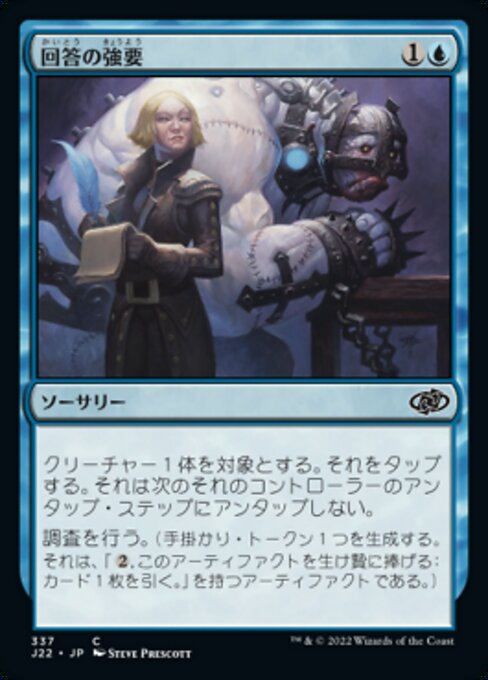 ![]() Variations— Parts— | 回答の強要クリーチャー1体を対象とする。それをタップする。それは次のそれのコントローラーのアンタップ・ステップにアンタップしない。 調査を行う。(手掛かり・トークン1つを生成する。それは、「