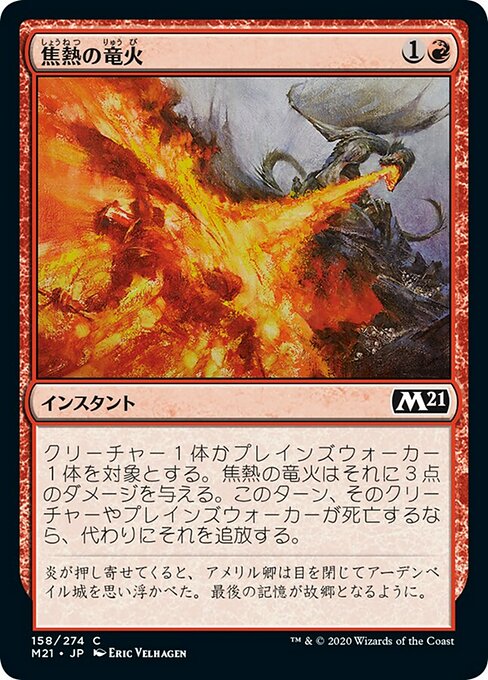 ![]() Variations— Parts— | 焦熱の竜火クリーチャー1体かプレインズウォーカー1体を対象とする。焦熱の竜火はそれに3点のダメージを与える。このターン、そのクリーチャーやプレインズウォーカーが死亡するなら、代わりにそれを追放する。