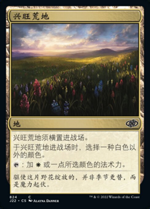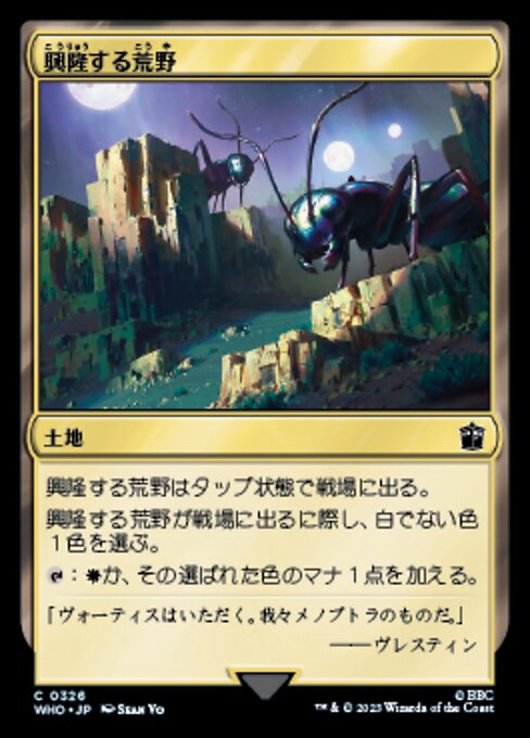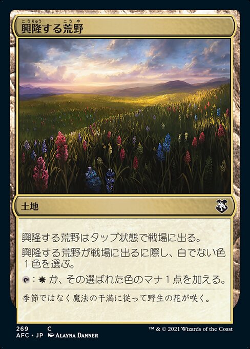 |  Variations— Parts— | 興隆する荒野興隆する荒野はタップ状態で戦場に出る。 興隆する荒野が戦場に出るに際し、白でない色1色を選ぶ。