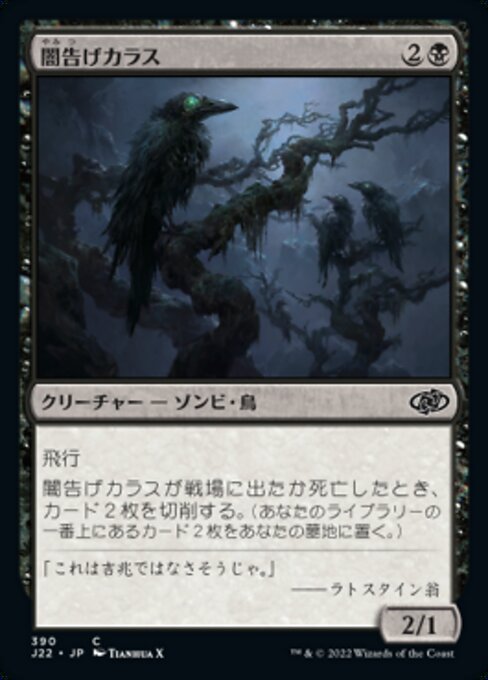 ![]() Variations— Parts— | 暗潮乌鸦2 / 1 飞行 当暗潮乌鸦进战场或死去时,磨两张牌。(将你牌库顶的两张牌置入你的坟墓场。)