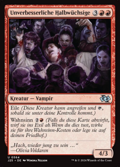 ![]() Variations— Parts— | Incorrigible Youths4 / 3 Haste (This creature can attack and Madness