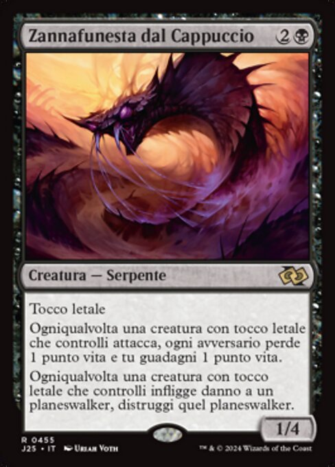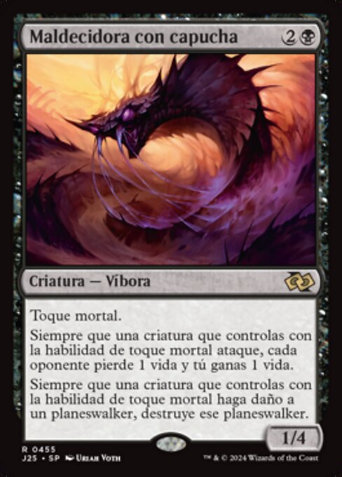 ![]() Variations— Parts— | Maldecidora con capucha1 / 4 Toque mortal. Siempre que una criatura que controlas con la habilidad de toque mortal ataque, cada oponente pierde 1 vida y tú ganas 1 vida. Siempre que una criatura que controlas con la habilidad de toque mortal haga daño a un planeswalker, destruye ese planeswalker.