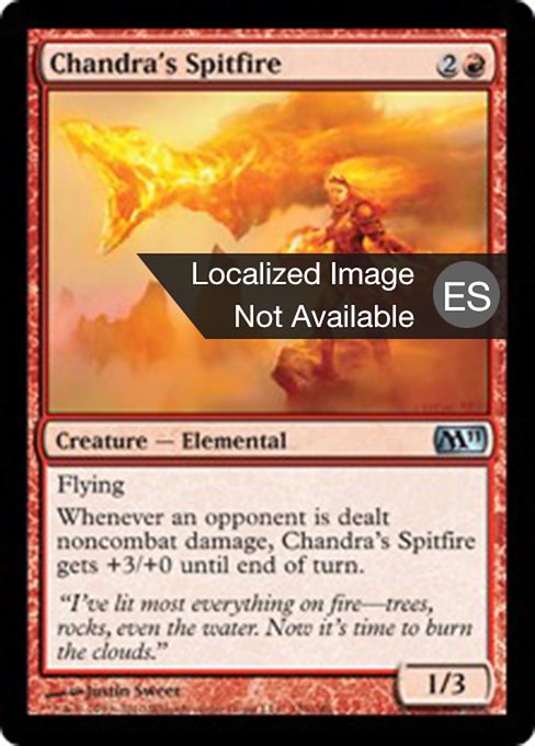 ![]() Variations— Parts— | Escupefuego de Chandra1 / 3 Vuela. Siempre que un oponente reciba daño que no sea de combate, el Escupefuego de Chandra obtiene +3/+0 hasta el final del turno.