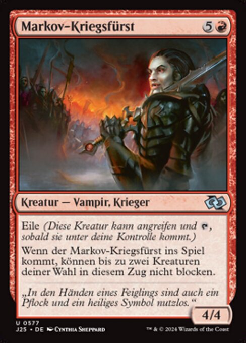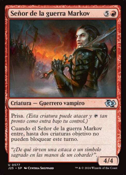 ![]() Variations— Parts— | Señor de la guerra Markov4 / 4 Prisa. (Esta criatura puede atacar y Cuando el Señor de la guerra Markov entre, hasta dos criaturas objetivo no pueden bloquear este turno.