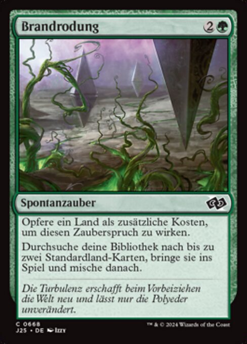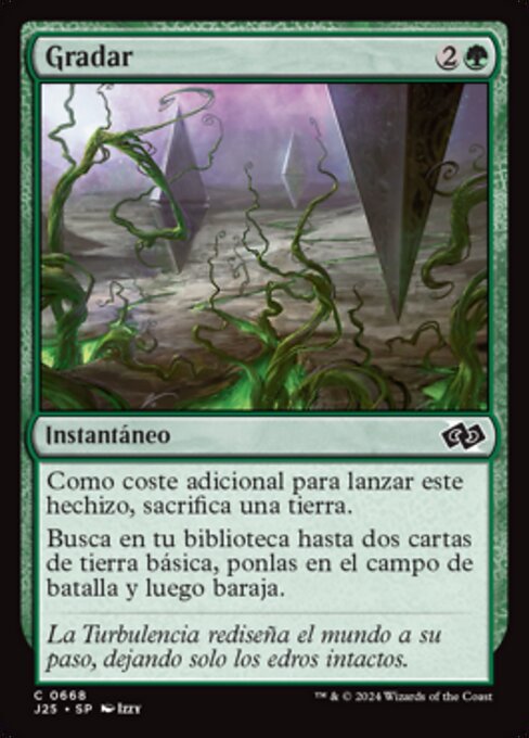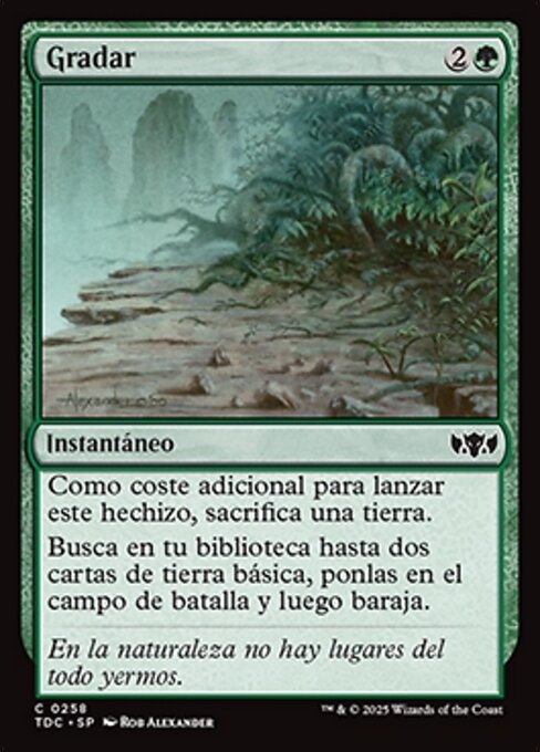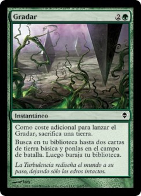 |  Variations— Parts— | GradarComo coste adicional para lanzar este hechizo, sacrifica una tierra. Busca en tu biblioteca hasta dos cartas de tierra básica, ponlas en el campo de batalla y luego baraja.