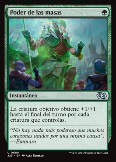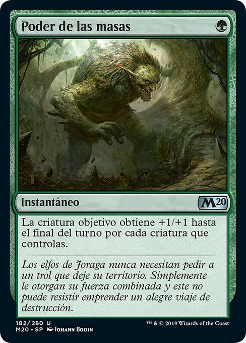 |  Variations— Parts— | Poder de las masasLa criatura objetivo obtiene +1/+1 hasta el final del turno por cada criatura que controlas.