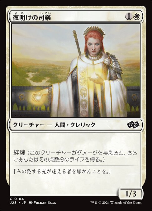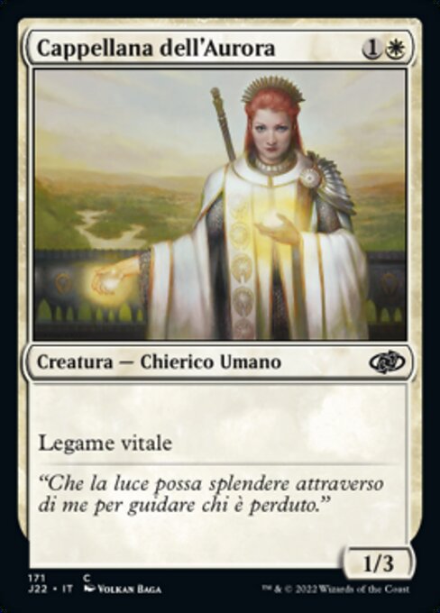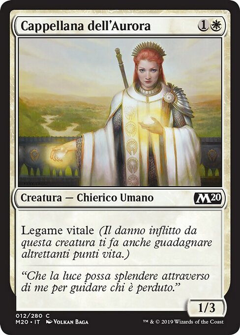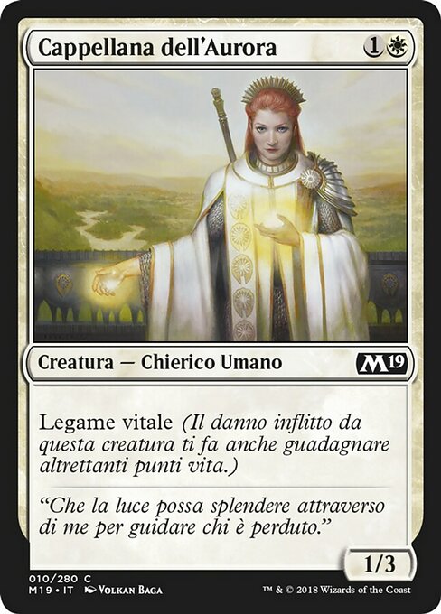 ![]() Variations— Parts— | Cappellana dell'Aurora1 / 3 Legame vitale (Il danno inflitto da questa creatura ti fa anche guadagnare altrettanti punti vita.)